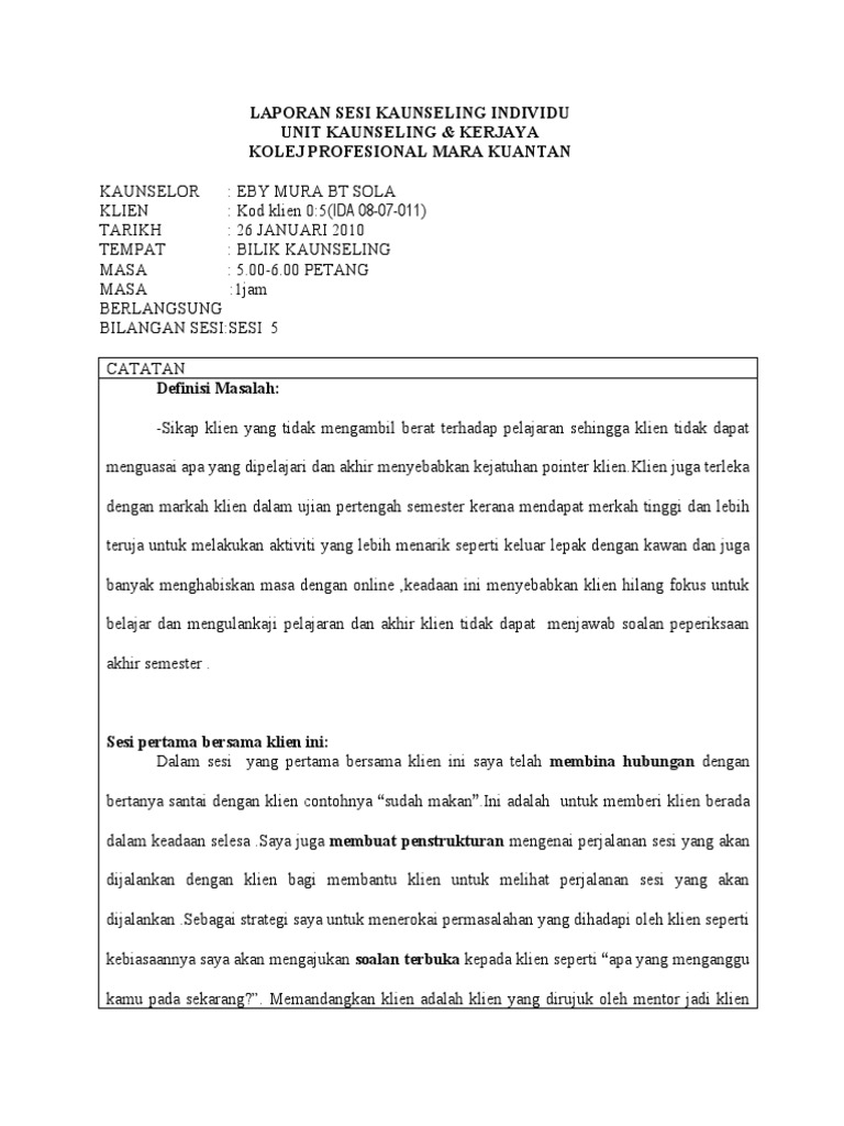 Laporan Sesi Kaunseling Individu : Laporan sesi kaunseling individu tape 5.. Bagi pengurus pp pesantren tebuireng jombang. Konseling individu terjadi ketika seorang konselor bertemu secara pribadi dengan seorang siswa untuk tujuan konseling. Selepas sesi kaunseling, klien didapati mempunyai harapan yang tinggi. Tekanan dalam pelajaran dan perhubungan dengan keluarga. Konseling individual menurut definisi, konseling individu yaitu merupakan salah satu pemberian bantuan secara perseorangan dan secara langsung.